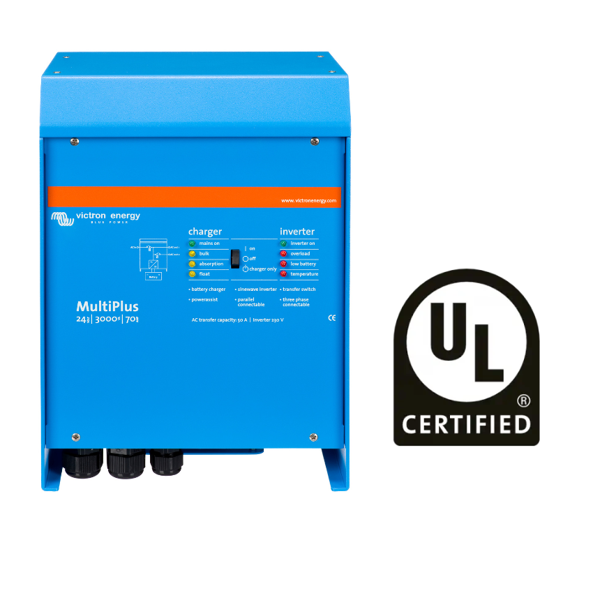 The Multiplus 24/3000/70-50 is a UL-certified 24-Volt 3000-Watt pure sine wave inverter with an adaptive 70A battery charger and a high-speed 50A transfer switch. The inverter’s output is 120V AC.
